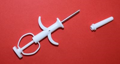 De chip wordt ingebracht onder de huid van het dier met behulp van een holle injectienaald. Op deze foto ziet u zo'n injectienaald, het naaldje zelf is 2,5 millimeter breed en 2,5 centimeter lang.